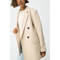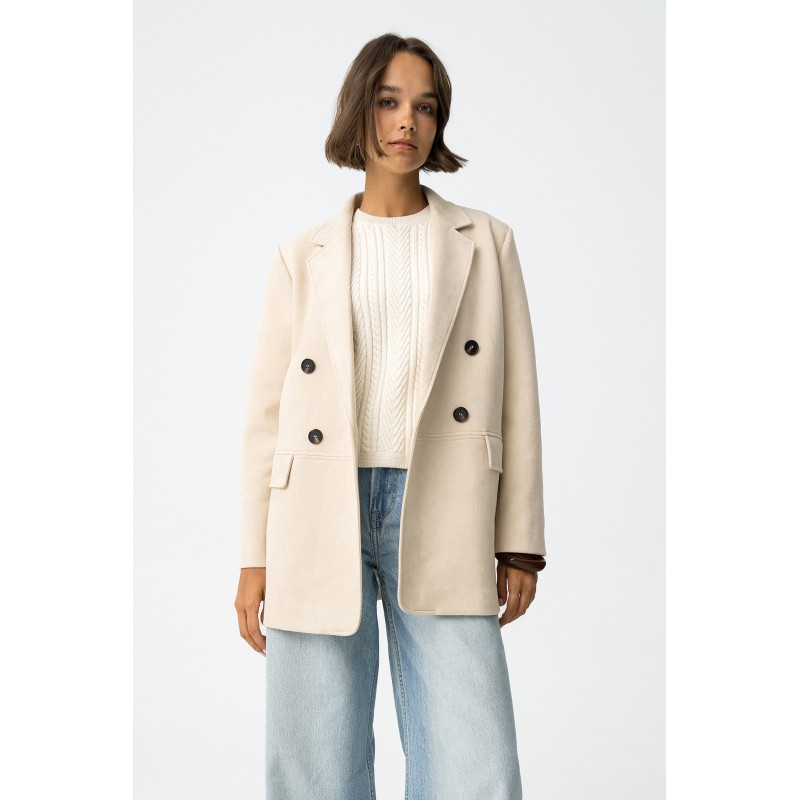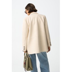 Blazer de corte relajado en tono beige, con doble botonadura y bolsillos frontales con solapa.