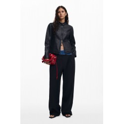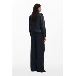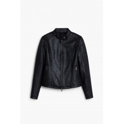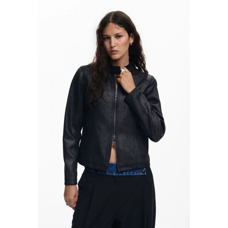 Chaqueta regular fit corta para mujer en efecto piel, cierre de cremallera, cuello estilo mao, bolsillos frontales y con tejido de punto en el interior de las mangas.