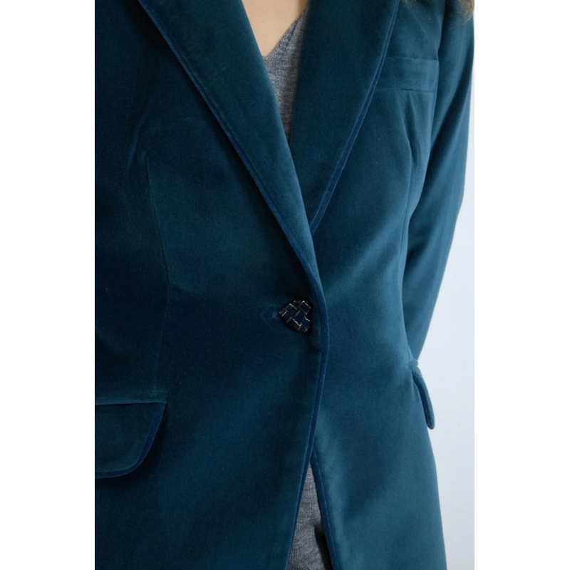 Chaqueta americana para mujer. Entallada en terciopelo. Cuello con solapa de muesca. Cierre frontal con botón joya. Manga larga con falso cierre abotonado y ligera abertura. Bajo recto sin aberturas. Falsos bolsillos de solapa.