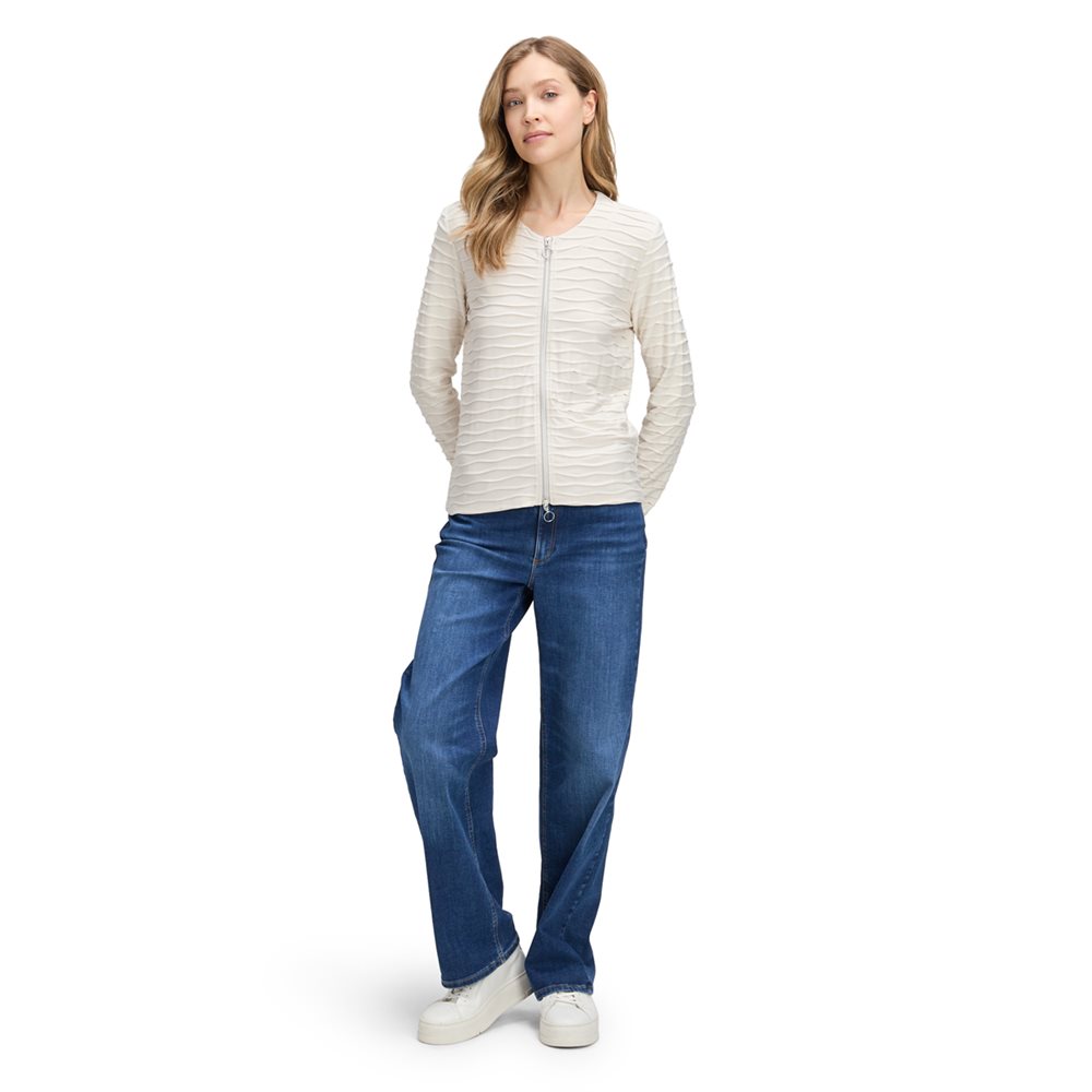 Cardigan con efecto ondulado para mujer. El cuello redondo y la cremallera bidireccional con tirador de anilla le dan un toque deportivo y chic. Confeccionada en una suave mezcla de viscosa con un toque de elastano, ofrece comodidad, elasticidad y un estilo desenfadado. Perfecta para combinar con looks de diario.