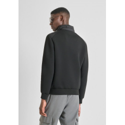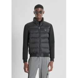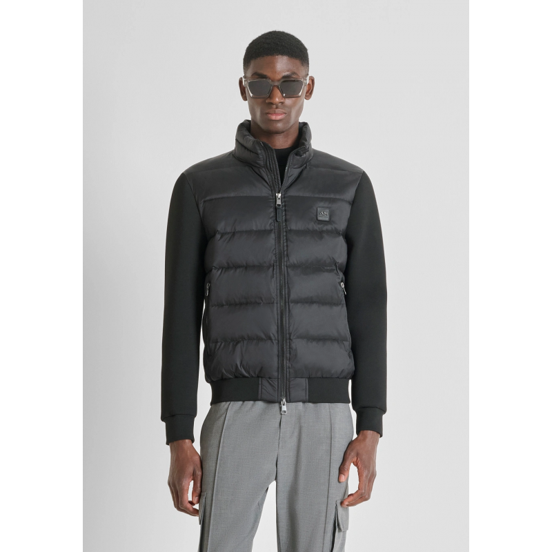 Chaqueta de plumón para hombre. De corte entallado, confeccionada en nailon brillante. Este tejido le confiere resistencia y versatilidad, tanto estética como funcional. Su característica especial son las mangas en contraste, confeccionadas en punto elástico de neopreno. Cierre frontal con cremallera de doble cursor y dos bolsillos laterales con cremallera. Logotipo de parche aplicado en la parte delantera.