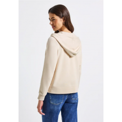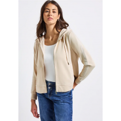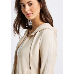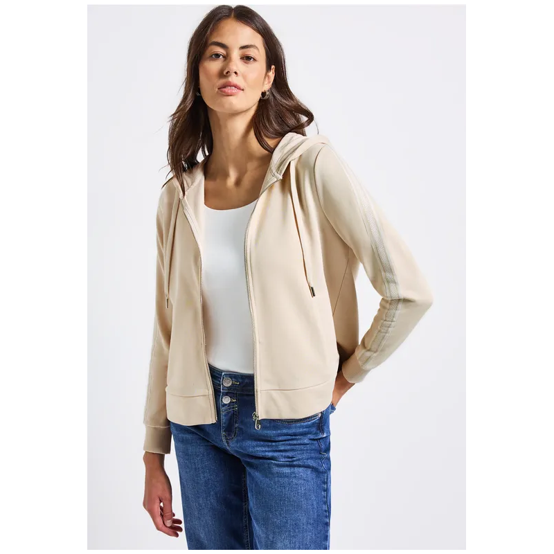 Chaqueta con capucha para mujer. Los ribetes en las mangas y la cinta decorativa le dan un toque elegante, mientras que los puños acanalados, los bolsillos laterales y la capucha con cordón garantizan comodidad. Su suave tejido de felpa convierte a esta sudadera con cremallera en la prenda perfecta para looks informales.