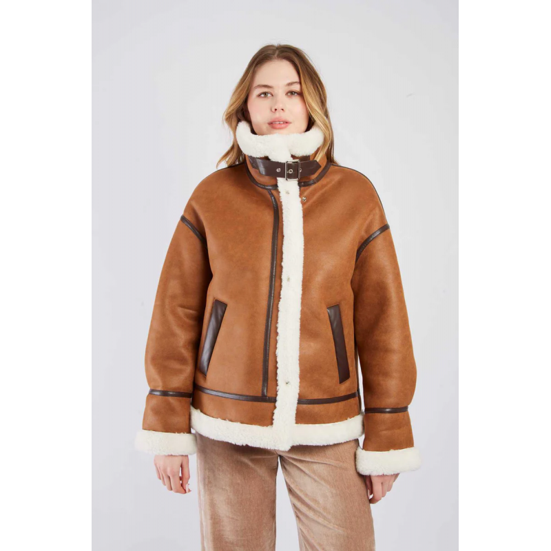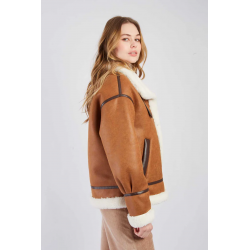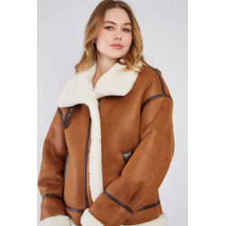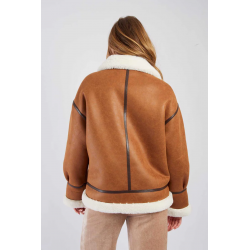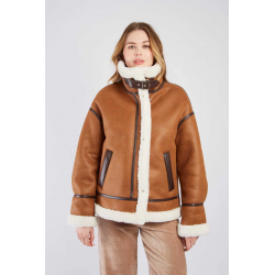 Chaqueta bomber corta para mujer. Con cuello alto. Piel sintética forrada con pelo sintético, mangas largas, cierre de cremallera con ribete en contraste. Bolsillos delanteros.