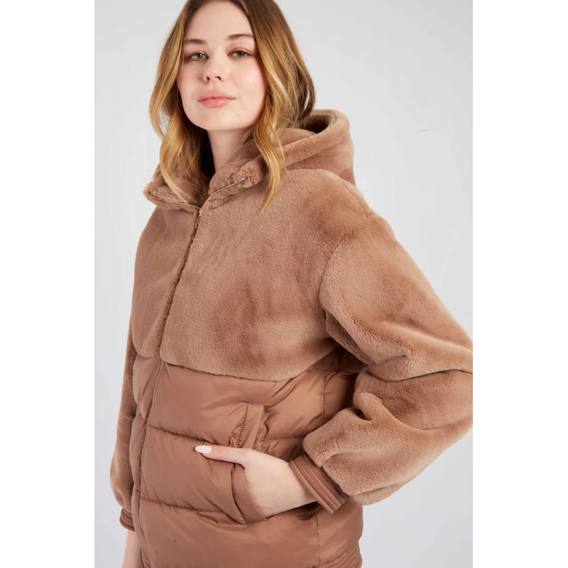 Chaqueta de plumón para mujer. Con capucha que combina dos materiales para un estilo único: la parte superior es de suave piel sintética y la inferior de tejido acolchado. Dos prácticos bolsillos delanteros y un cierre de cremallera completan este modelo cómodo y cálido, perfecto para el invierno.