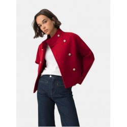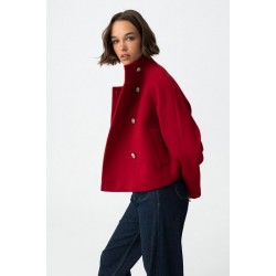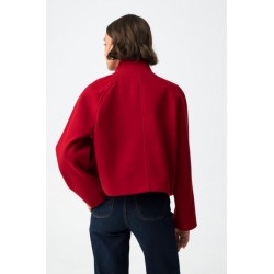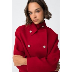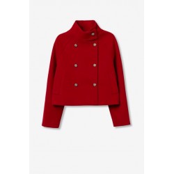 Chaqueta corta para mujer relaxed fit con doble cruce, dos bolsillos frontales y cierre de botones metálicos, cuello alto y manga larga.