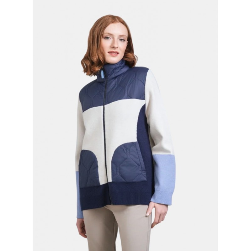 Chaqueta combinada para mujer de bolsillos delanteros, diseño diferentes texturas y colores, cierre de cremallera , cuello alto y mangas largas acanaladas.