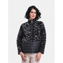 Chaqueta combinada para mujer de diseño estampado, cierre de cremallera, cuello alto y mangas largas.