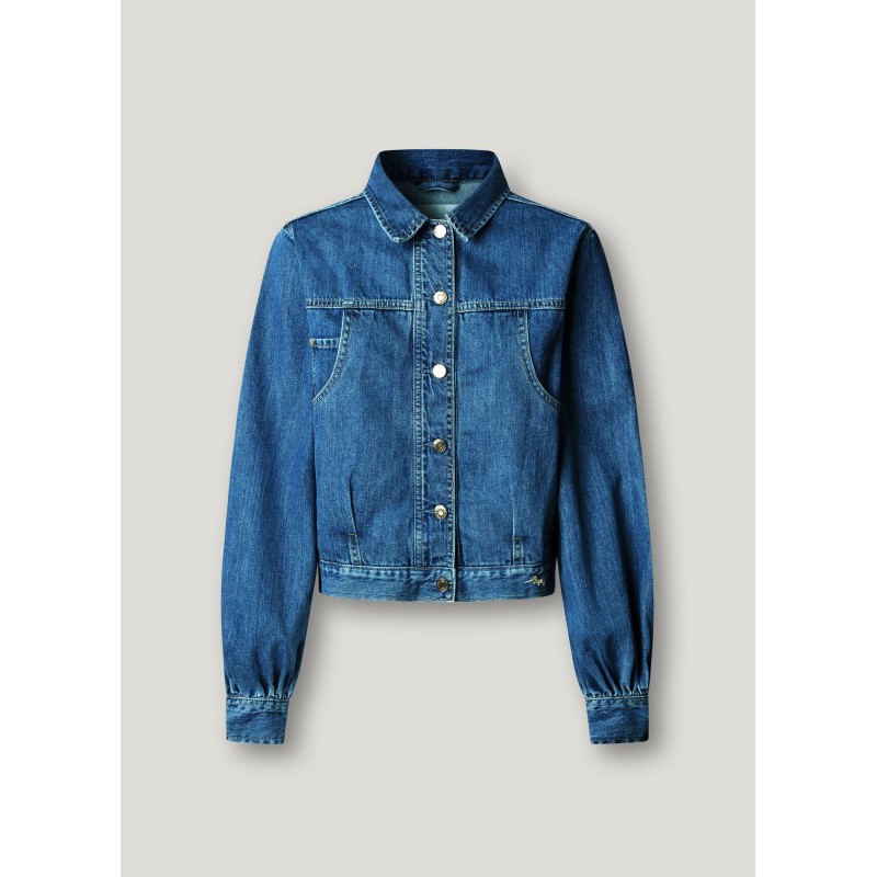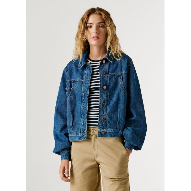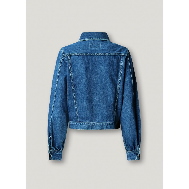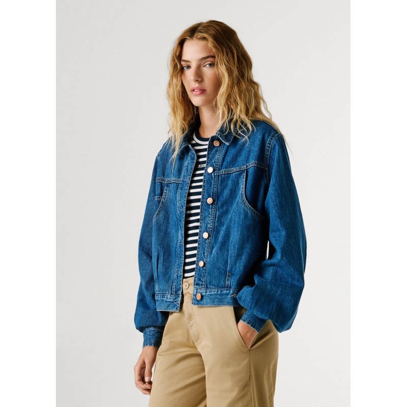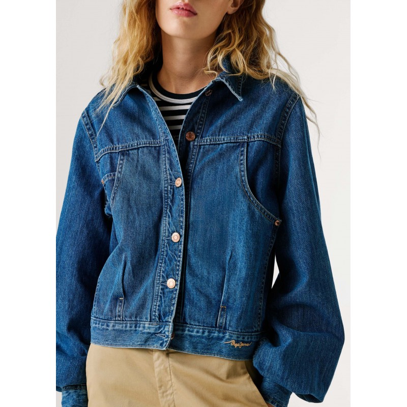 Cazadora denim regular fit para mujer de cierre frontal abotonado, logo en en contraste bordado en el bajo, bolsillo monedero al interior del bolsillo derecho en el pecho más bolsillos de parche con entrada diagonal en el pecho y manga larga abullonada con puños ajustables