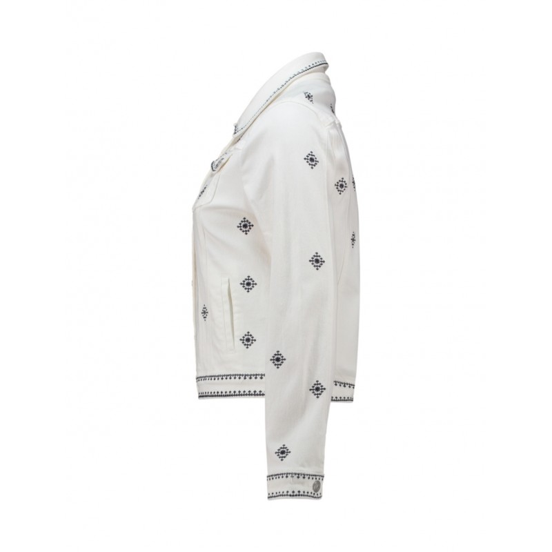 Cazadora denim con cuello solapa y manga larga. Cierre frontal con botones metálicos. Bolsillos frontales de con solapa y cierre de botón. Corte entallado. Detalle de aplicaciones de bordados.