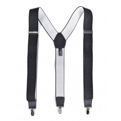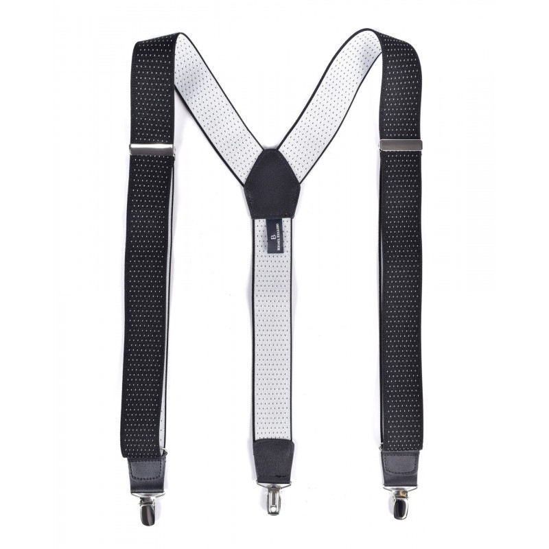 Tirantes de cinta elástica para hombre. Con diseño de micro púas contrastadas con el color de fondo. Los terminales son de piel legítima con el logotipo de la marca grabado a fuego. Sistema de sujeción sencillo para pinza metálica.