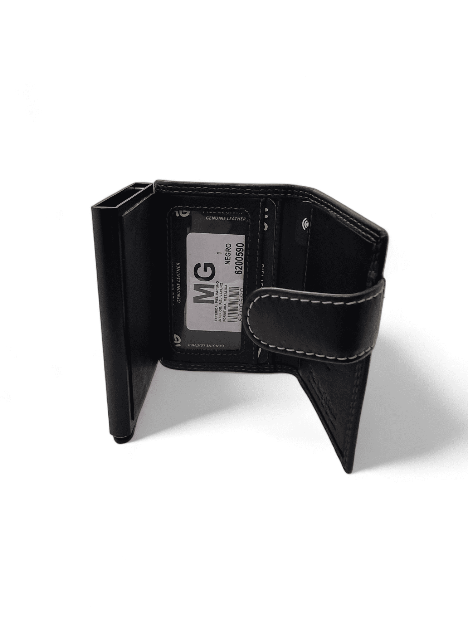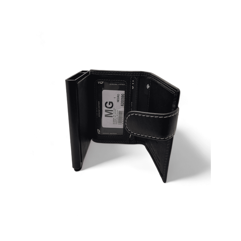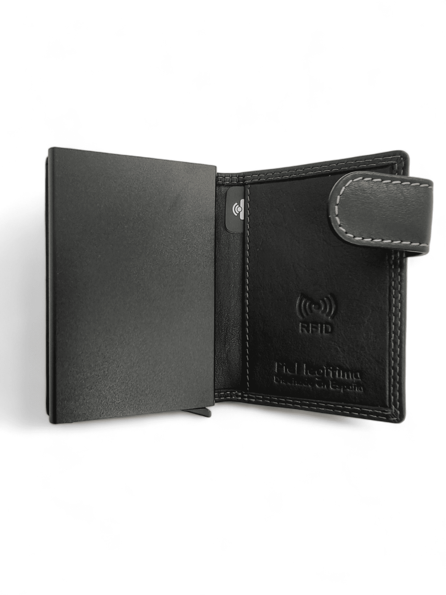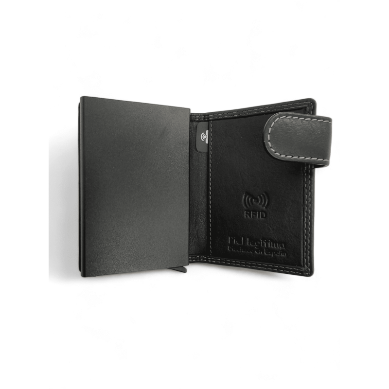 Tarjetero de piel vacuno para hombre. Compartimentos para tarjetas metalizado ,con cierre de trabilla para mas seguridad.