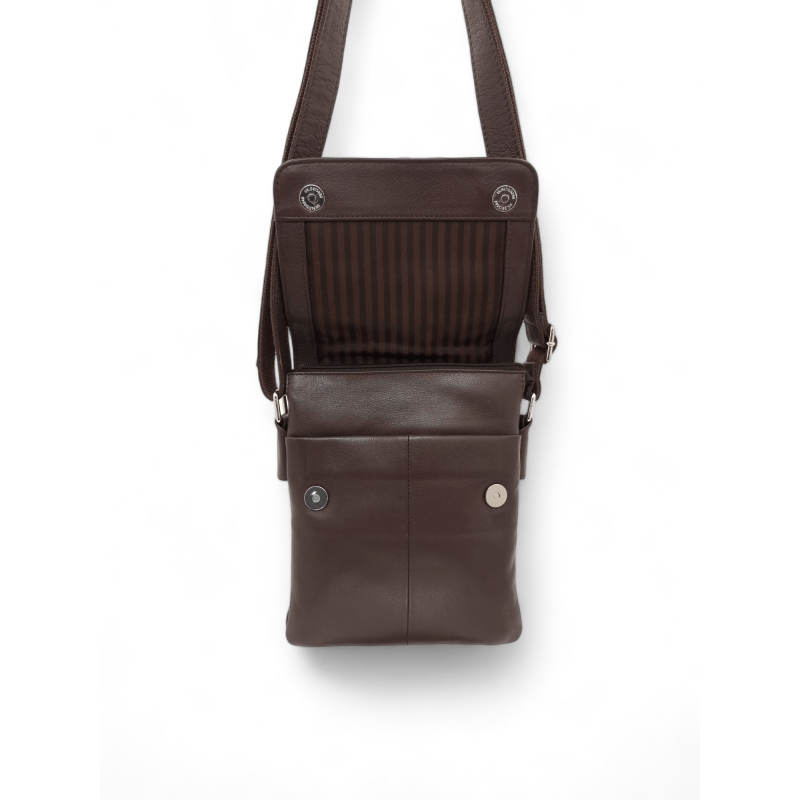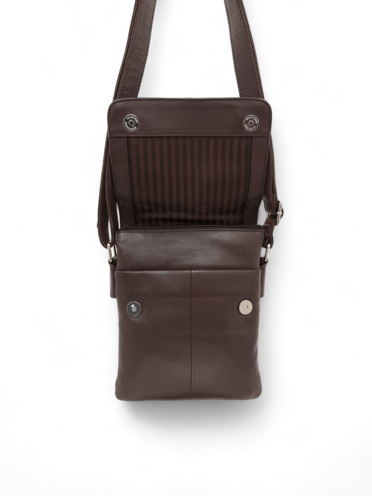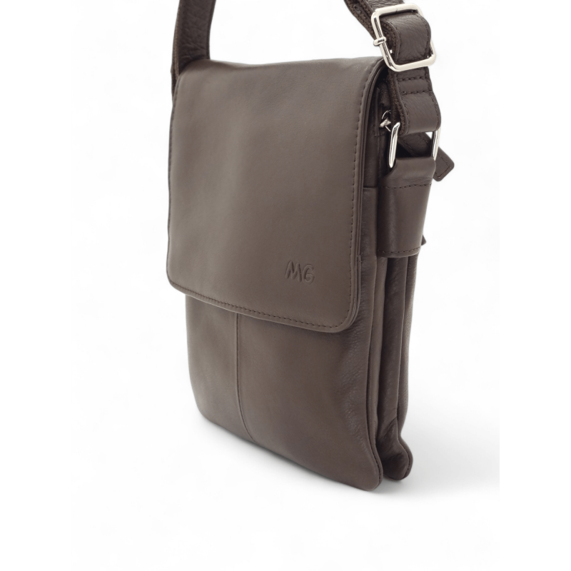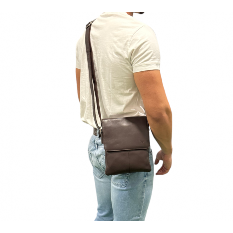 Bolso tipo bandolera de piel para hombre. Se cierra con una cremallera en la parte superior para mayor seguridad. Bolsillo frontal y trasero. Asa ajustable.