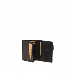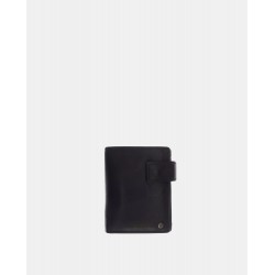 Cartera de piel diseño vertical con cierre de solapa y clip, detalle de la marca, cinco compartimentos para tarjetas y otro para billetes.