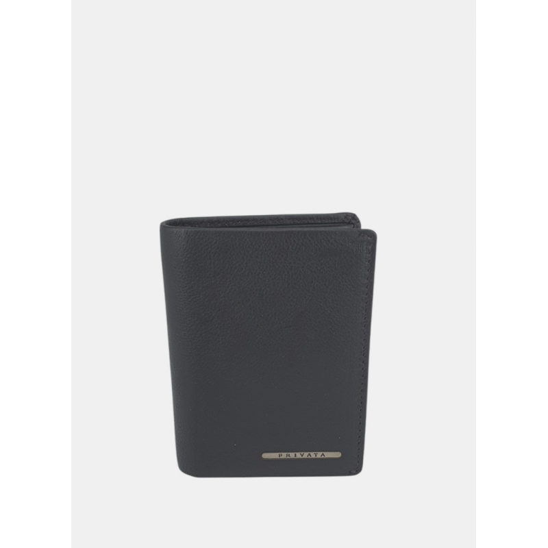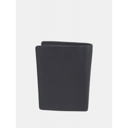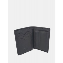 Cartera en piel de diseño vertical para hombre, detalles de la marca, en su interior compartimentos para llevar billetes más organizar tarjetas y documentación y un pequeño monedero  con cierre de solapa y broche de presión.
