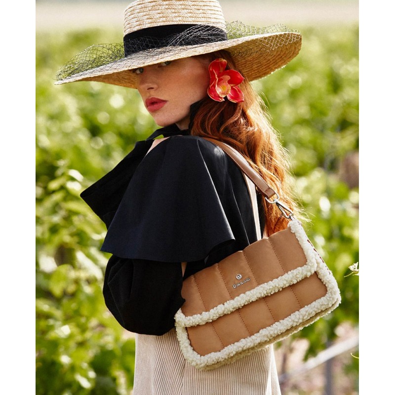 Bolso baguette Isabella confeccionado en Nylon y detalles de borreguillo. Tiene dos posiciones para llevarlo, de hombro o bandolera. Detalles metálicos de color plata y logo de Binnari en la parte delantera.