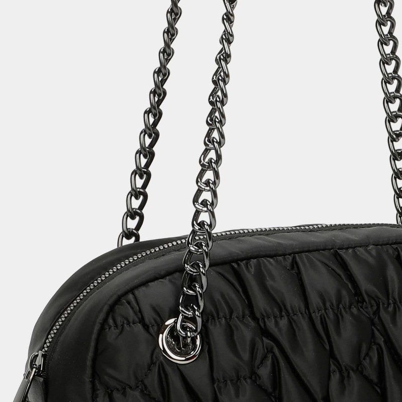 Bolso acolchado de hombro con cierre de crema llera y asa ajustable. Tiene bolsillos en su interior, uno de ellos con cremallera. Toda sus detalles matálicos son de color nickel.