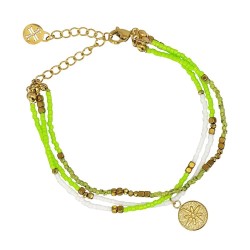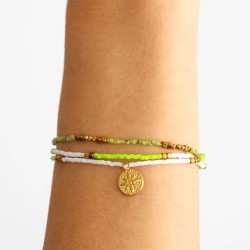 Pulsera de diseño con tres líneas de acero, hematita y vidrio. Cuenta con un encanto de medalla y un cierre ajustable para mayor comodidad.