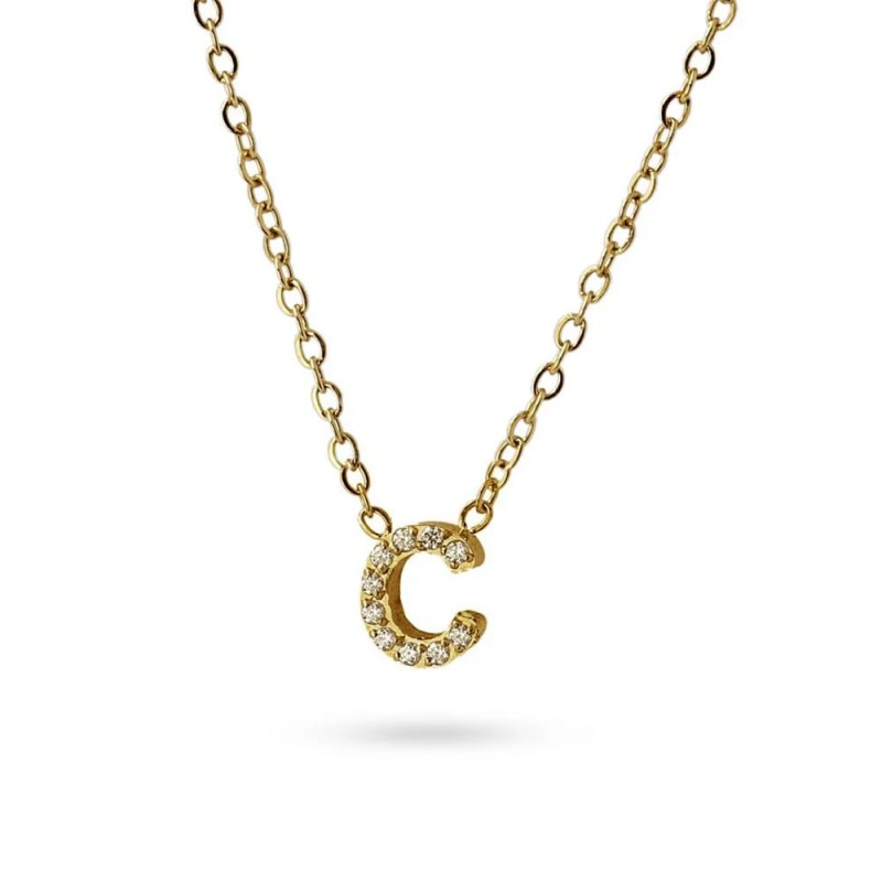 Collar corto formado por cadena de mini eslabones y colgante con letra mayúscula cubierta de circonitas blancas. Está realizado en acero quirúrgico color oro o plata, y por tanto no produce alergias, es inoxidable y se puede mojar.