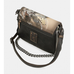 Bandolera para mujer de solapa inspirado en un estampado de un viaje al centro de la Tierra de material flexible que cuenta con cierre de solapa y bolsillo trasero. El bolso tiene un asa bandolera extraíble regulable a diferente largo, más un asa corta de eslabones. El interior es forrado y cuenta con bolsillos.