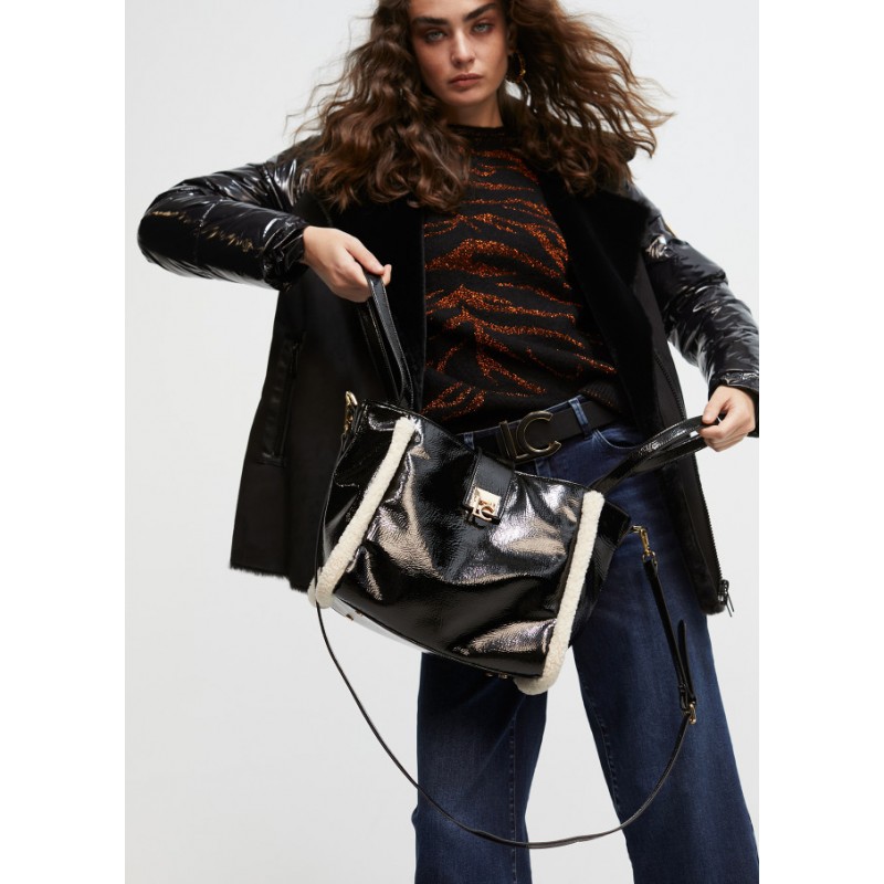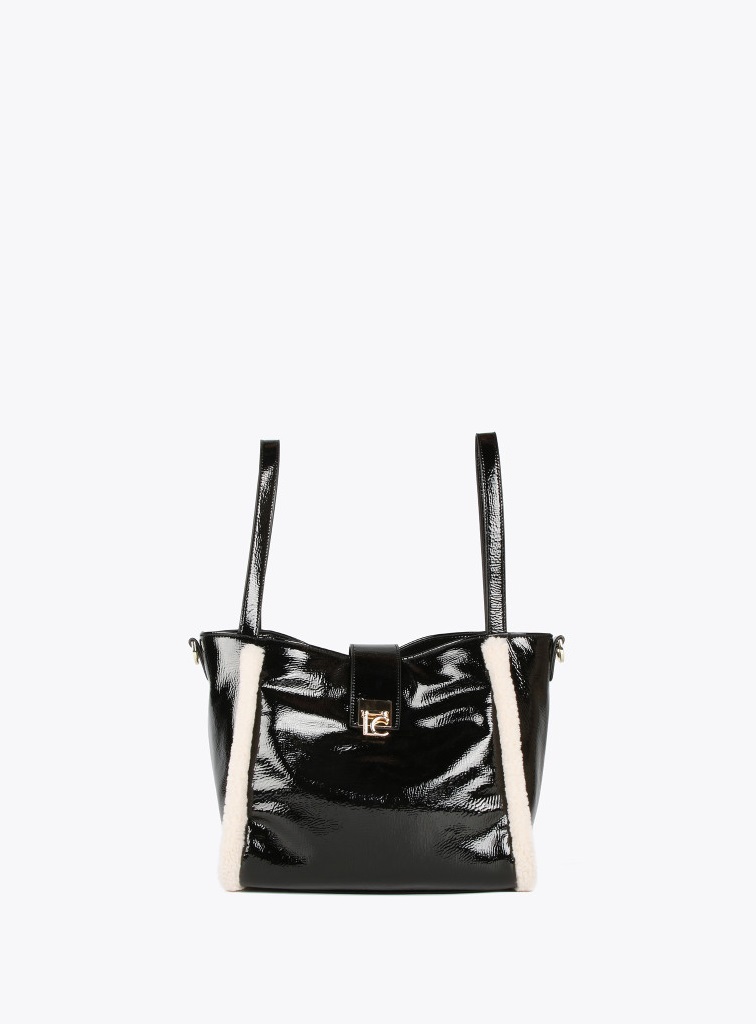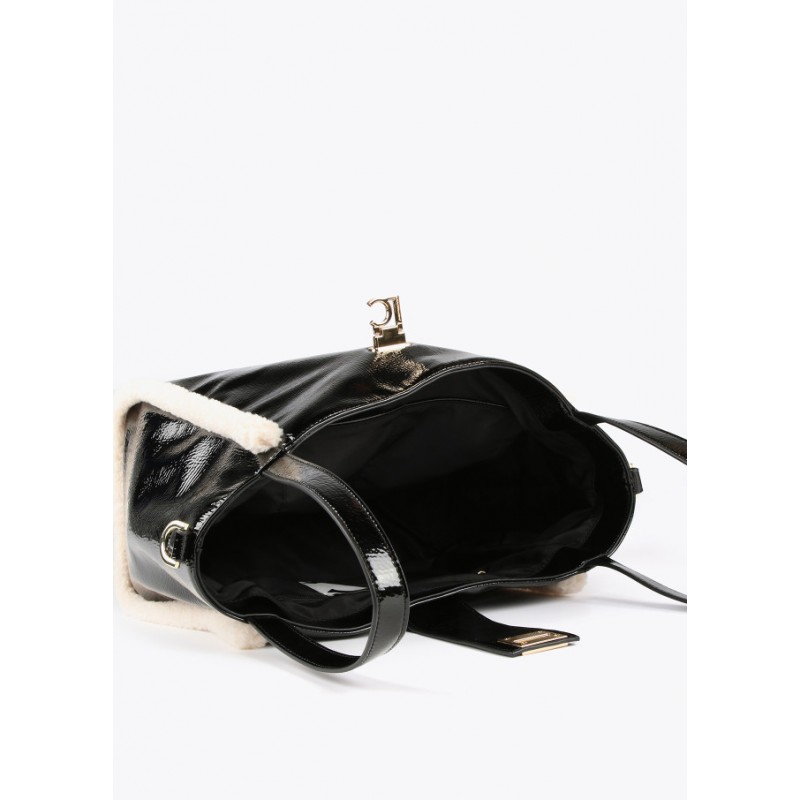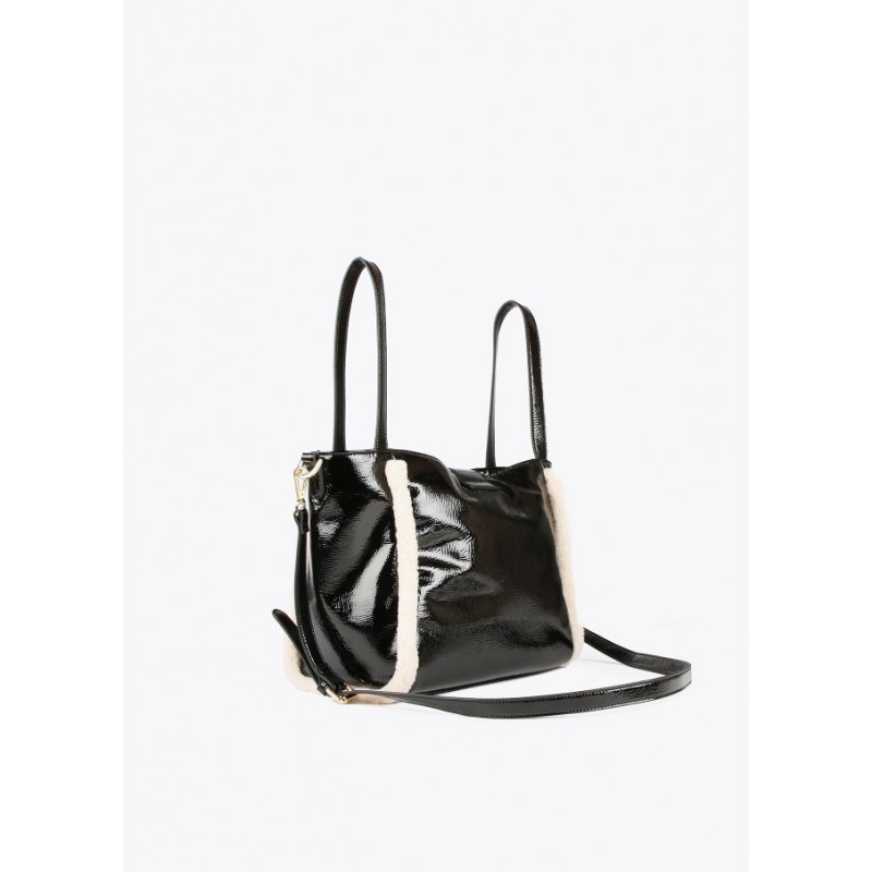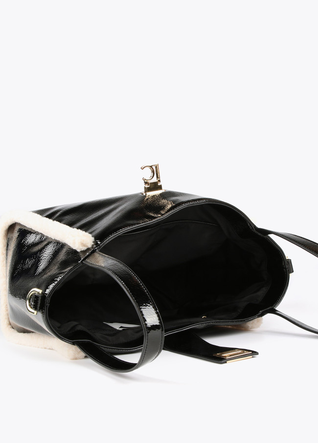 Bolso efecto piel brillante con detalles de borreguito para mujer. Asas de hombro y asa bandolera ajustable y extraíble. Logo dorado a modo de cierre con lengüeta.