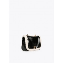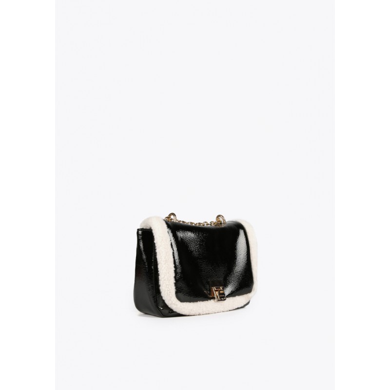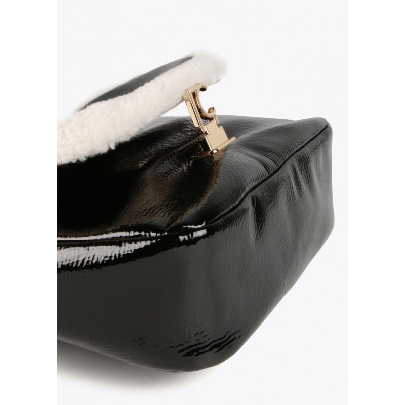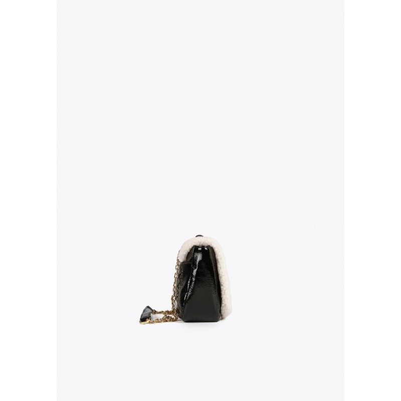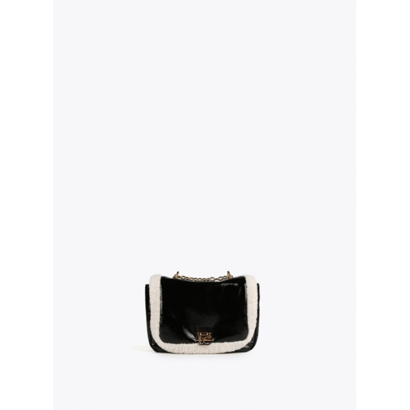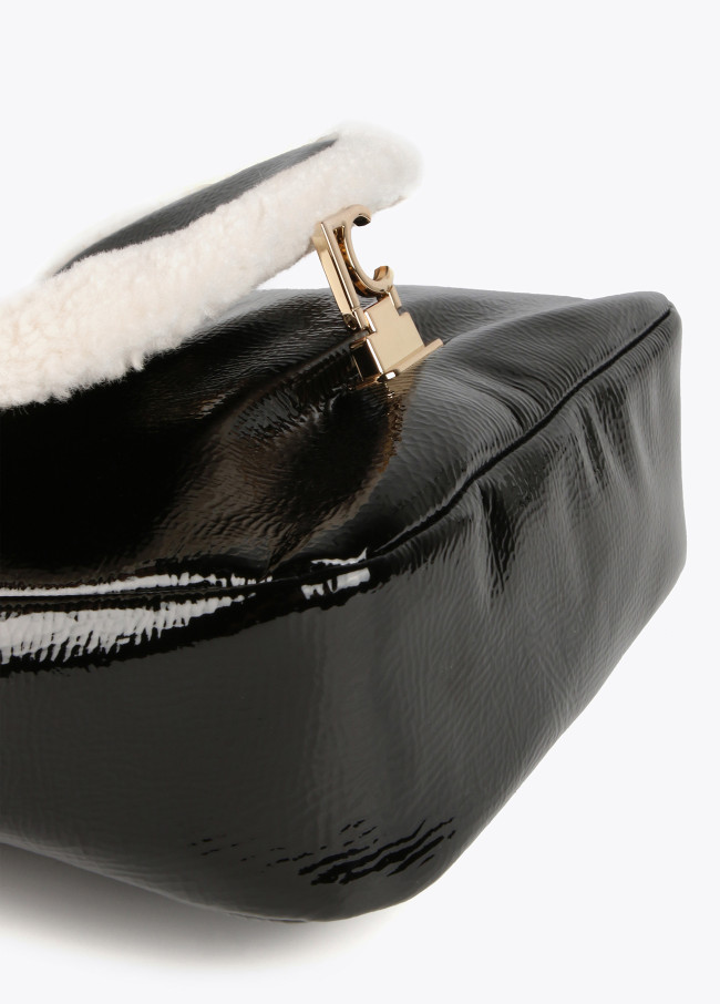 Bolso tipo bandolera en efecto piel brillante para mujer.Con borrego. Cierre con letras logotipo a modo de hebilla en solapa. Asa bandolera de cadena con zona protectora en efecto piel.