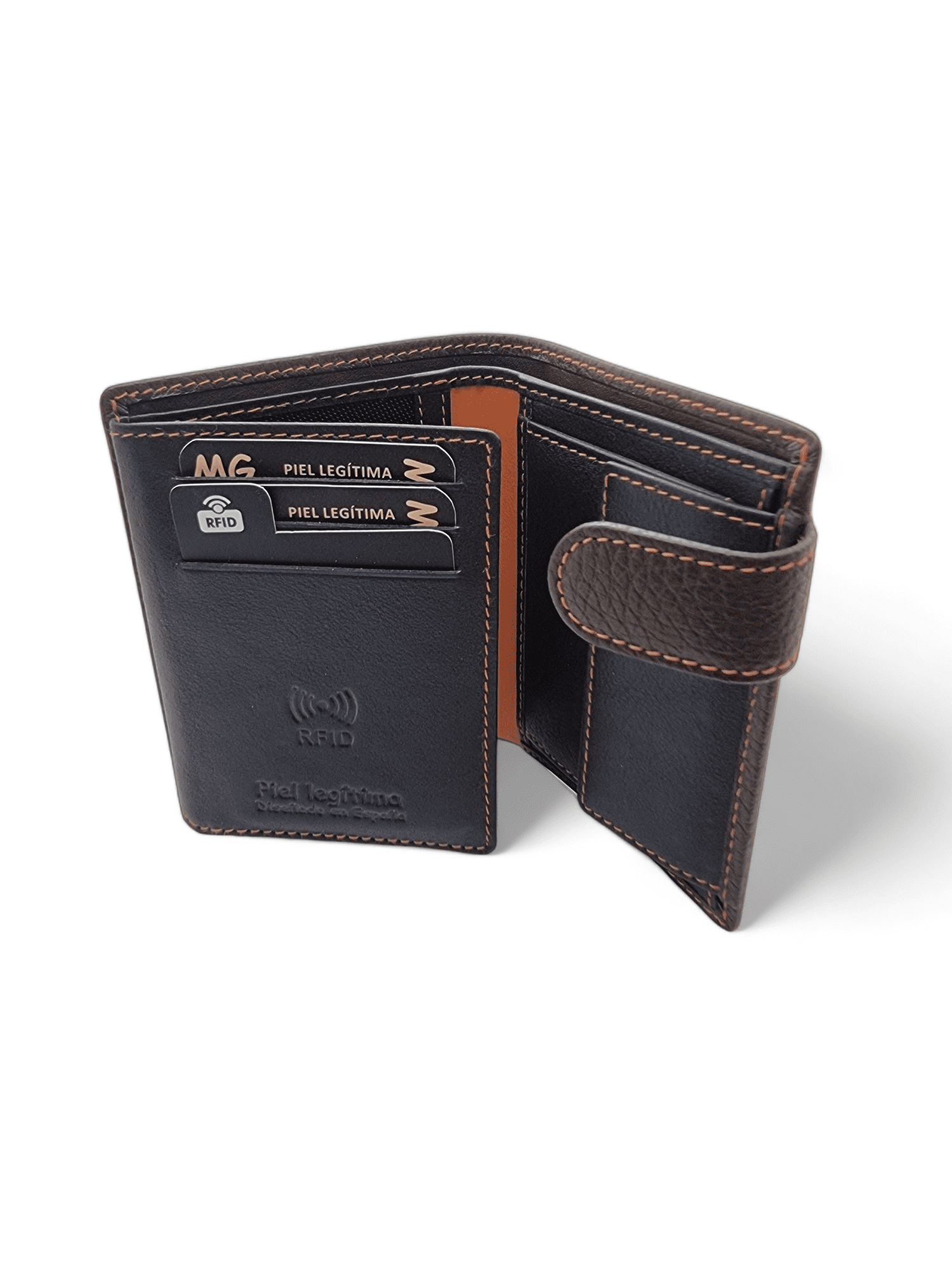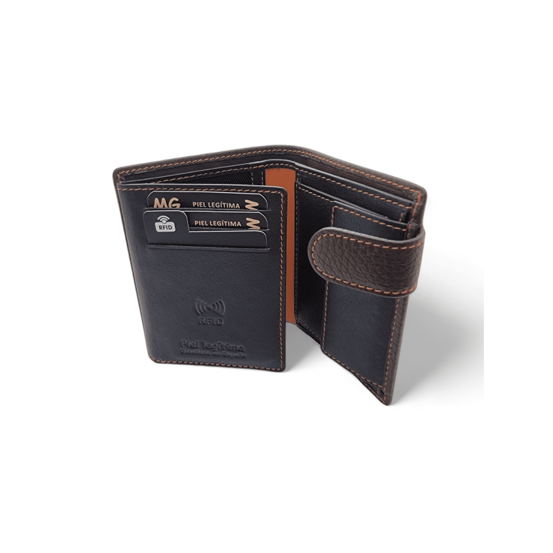 Cartera de piel vacuno para hombre. Monedero interior, 12 compartimentos para tarjetas, 2 para billetes y un sistema RFID anti robo.