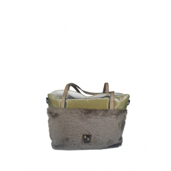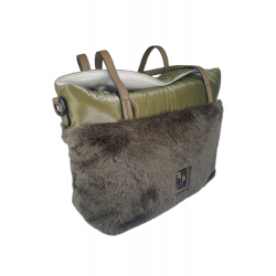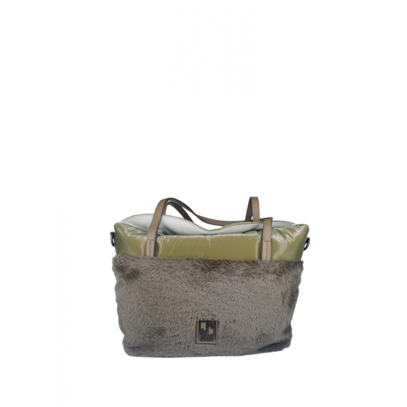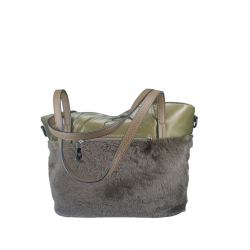 Bolso shopper para mujer brillante y paneles de suave pelo estilo peluche, cierre principal de cremallera, bolsillo exterior más bolsillos interiores con varios compartimentos y doble asa para llevar al hombro.