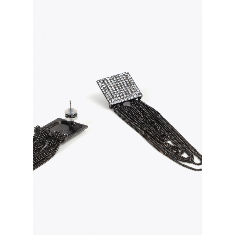 Pendientes sofisticados con base cuadrada para mujer. De cristales brillantes y detalle de tassel de cadenas metálicas. Diseño elegante con cierre de presión, ideal para eventos especiales. Un accesorio que combina esplendor y estilo moderno en un solo conjunto.