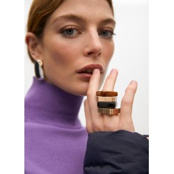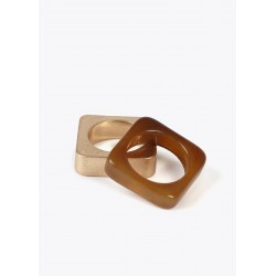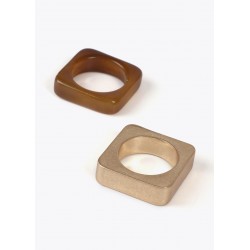 Pack anillos cuadrados para mujer. Fabricados con materiales de alta calidad. Uno en tono dorado mate y otro en negro brillante. Diseño moderno y elegante, ideal para complementar cualquier look. Incluyen un logotipo grabado discreto de la marca.