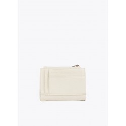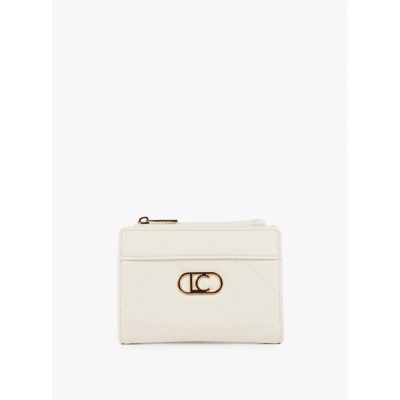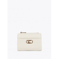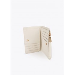Monedero de diseño monograma para mujer. Fabricado en material sintético robusto con cierre de botón y cremallera. Logo metálico frontal y múltiples compartimentos internos para tarjetas.