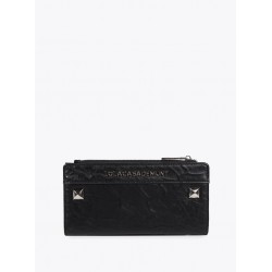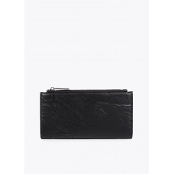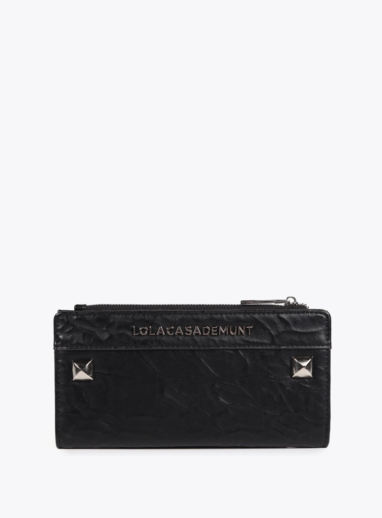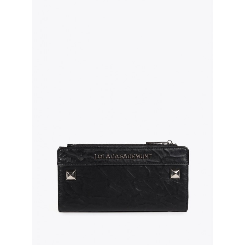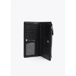 Billetero grande con efecto piel para mujer. Dispone de múltiples compartimentos para tarjetas, foto identificativa y cierre de cremallera. Acabado en color negro con detalle de logotipo metálico.