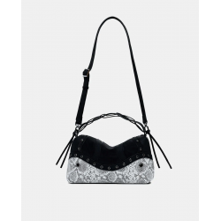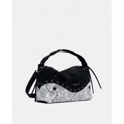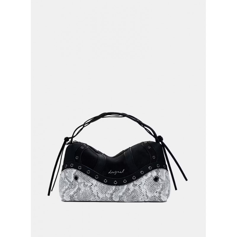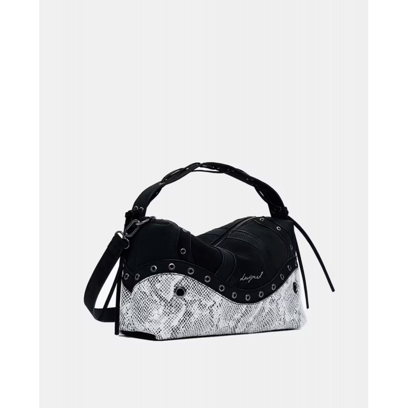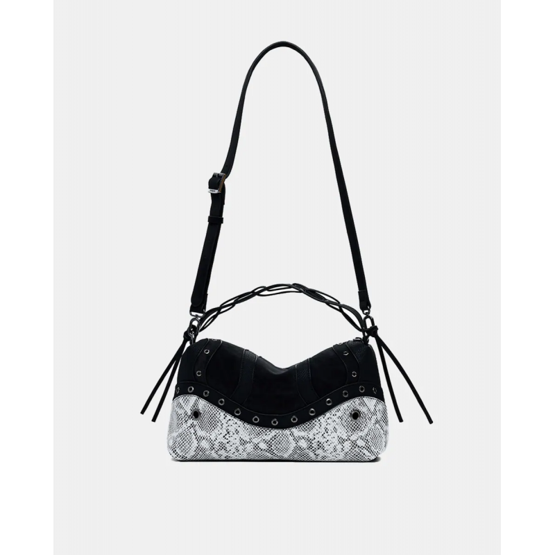Bolso de mano para mujer. Tamaño mediano, con combinación de tejidos, efecto serpiente, detalles de tachuelas metálicas, asas intercambiables y cierre de cremallera.