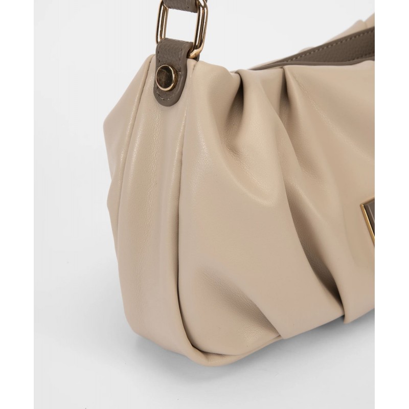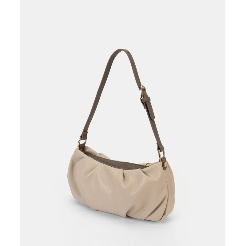 Bolso de hombro para mujer. Silueta alargada con efecto fruncido y forma cilíndrica envolvente. Logo metálico dorado en el centro del frontal. Asa granulada con hebilla dorada para ajustar el largo. Cremallera superior con solapa a contraste. Interior amplio con bolsillo extra y forro estampado.