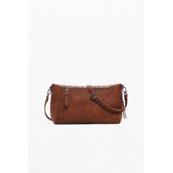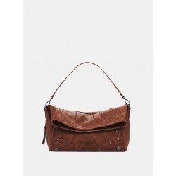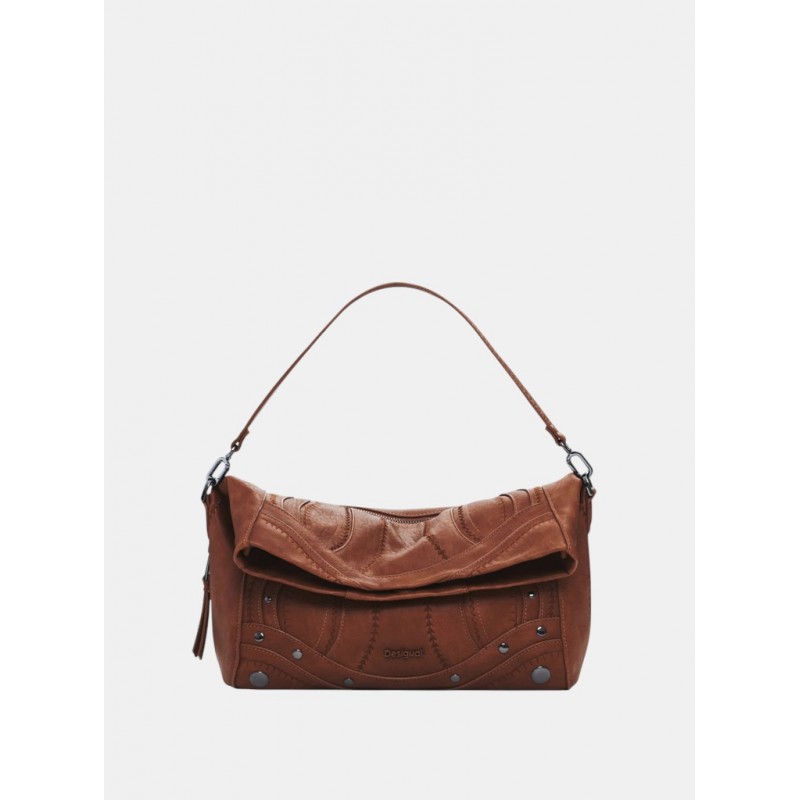 Bolso mediano para mujer en efecto piel, de color liso con efecto patch, solapa extensible, bordados 3D, fondo extensible con cremallera y detalle de tachuelas metálicas.