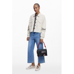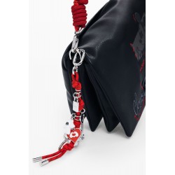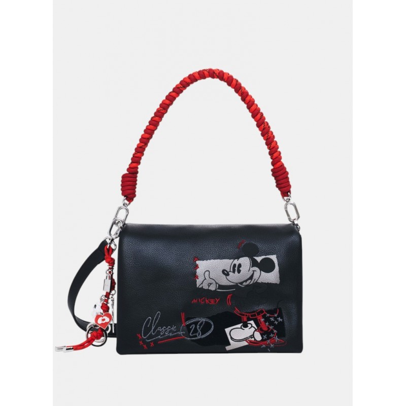 Bolso bandolera para mujer de tamaño mediano, cierre de cremallera y solapa, en tejido efecto piel, varios compartimentos interiores y asas intercambiables con estampado de Mickey Mouse.