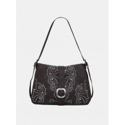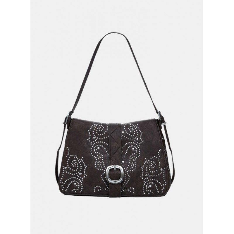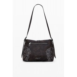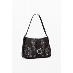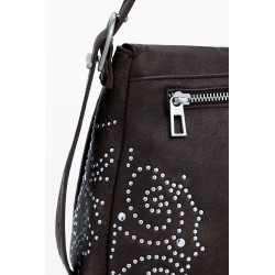 Bolso estilo bandolera de tamaño mediano, en tejido efecto piel, cierre de cremallera, detalle de tachuelas metálicas y hebilla decorativa.