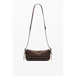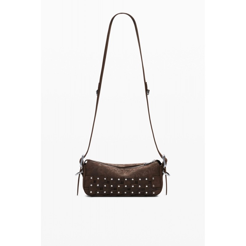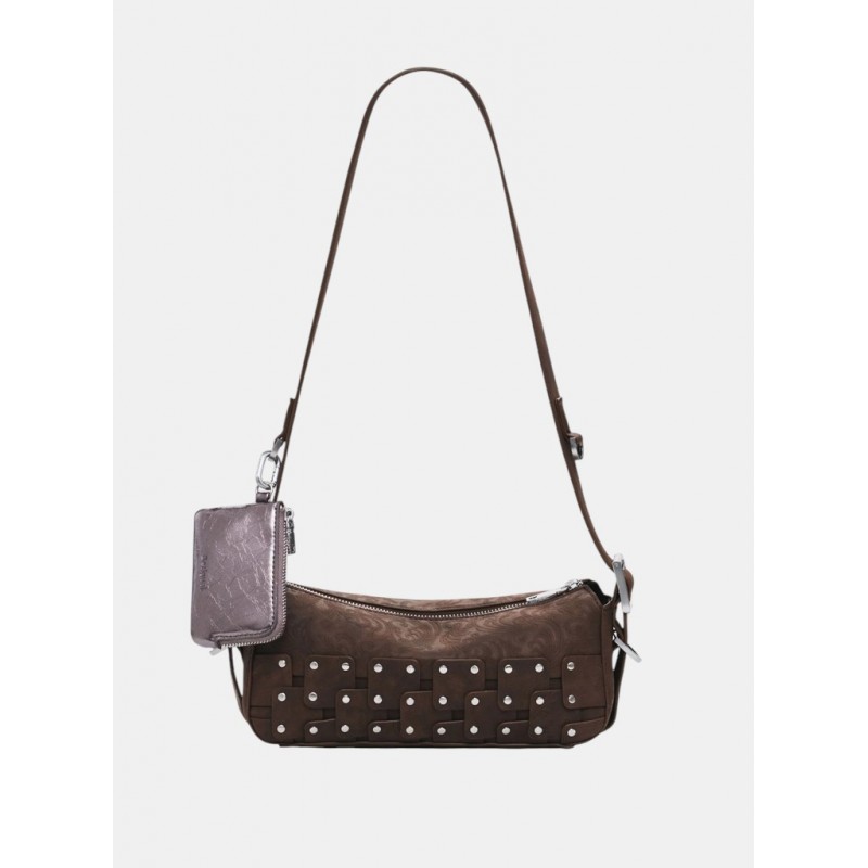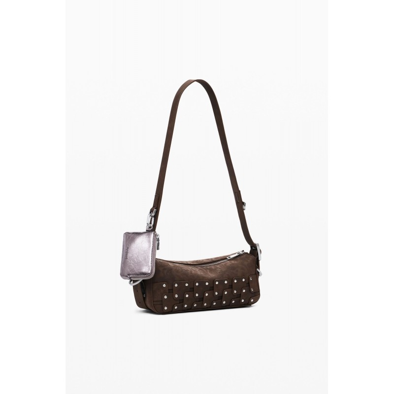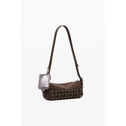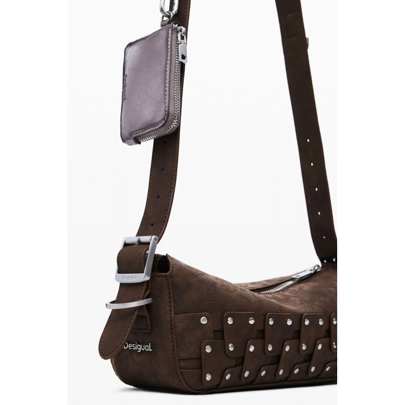 Bolso para mujer estilo bandolera tipo baguette estilo patchwork, en tejido efecto piel, con detalle de tachuelas metálicas, asa regulable y detalle de monedero extraíble.