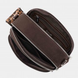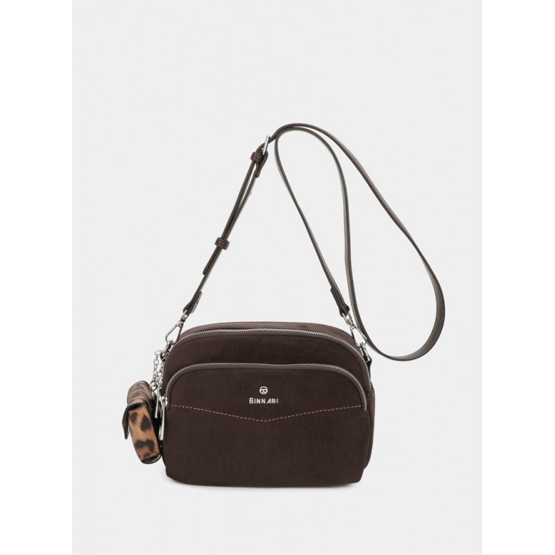 Bolso bandolera para mujer. Confeccionado en 2 materiales: antelina y pu. Asa ajustable. Exterior: chapón logo Binnari, bolsillo con cremallera y bolso pequeño extraible. 2 departamentos ambos con cremallera.
