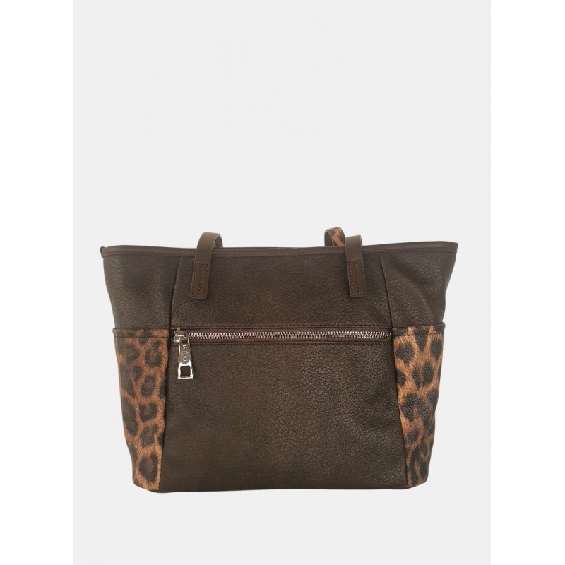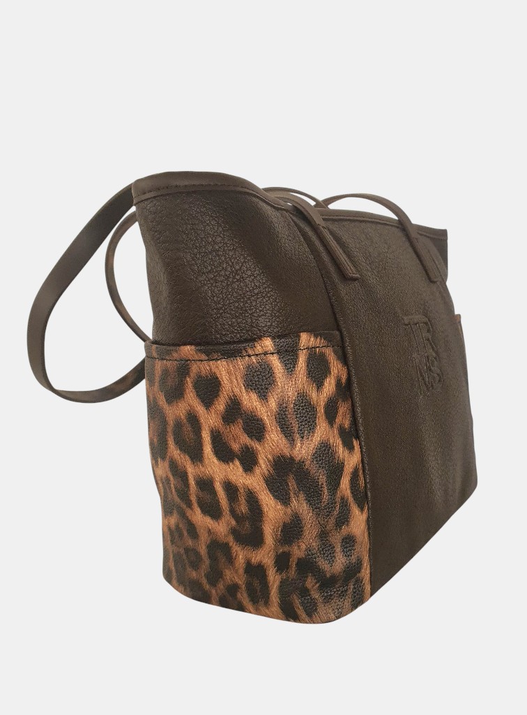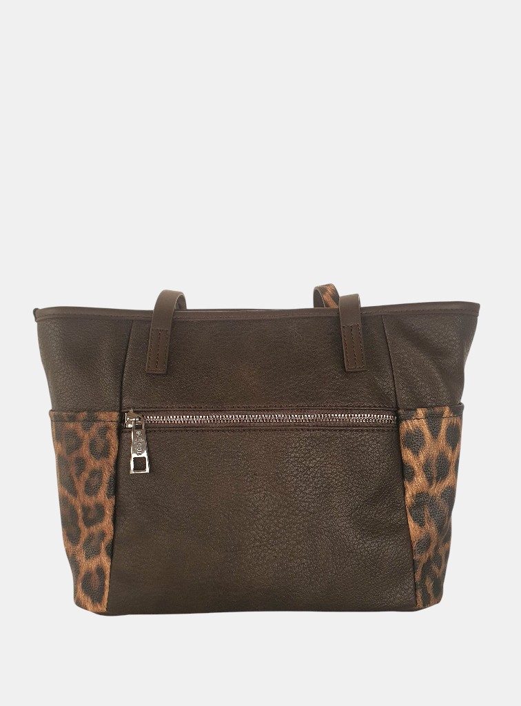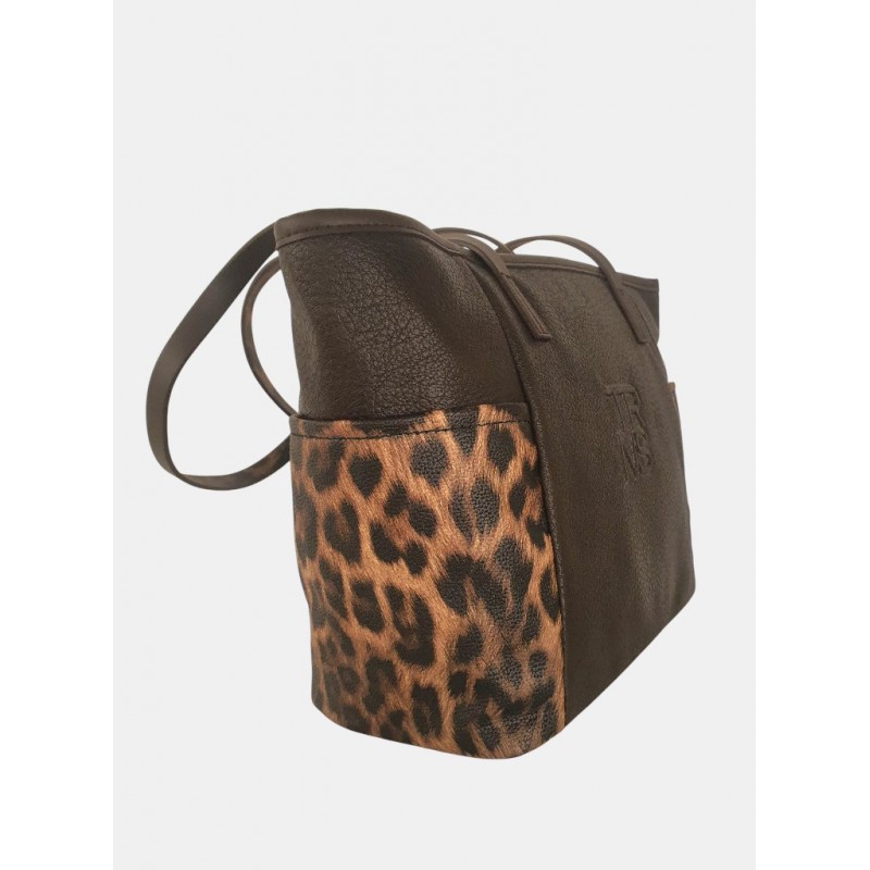 Bolso para mujer combinado con leopardo, cierre principal de cremallera, bolsillos exteriores y doble asa para llevar al hombro.