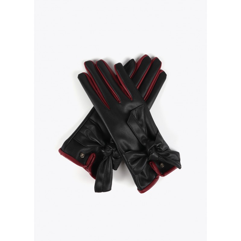 Guantes efecto piel para mujer. Con elegante lazo decorativo. Diseño en color negro con detalles en burdeos. Material suave y cálido, perfectos para el invierno. Estilo sofisticado con cierre a presión discreto. Acabados meticulosos reflejan un look moderno y refinado.