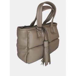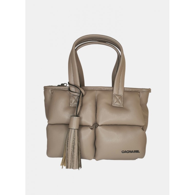Bolso mediano acolchado para mujer de cierre principal de cremallera detalle de adorno de flecos en sus doble asa para llevar al hombro, detalles de la marca y bolsillos exteriores e interiores.