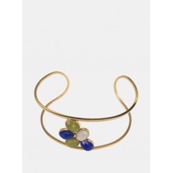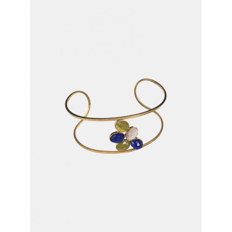 Pulsera brazalete para mujer de diseño de doble banda que se unen mediante un adorno de cinco piedras cabujón facetadas, de forma ovalada, en una combinación de colores que bohemio y colorido que dan un toque bohemio para dar un look diferente a tu día.
