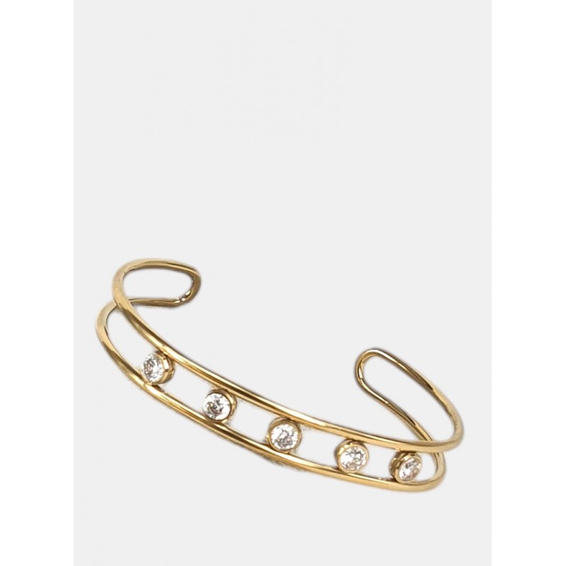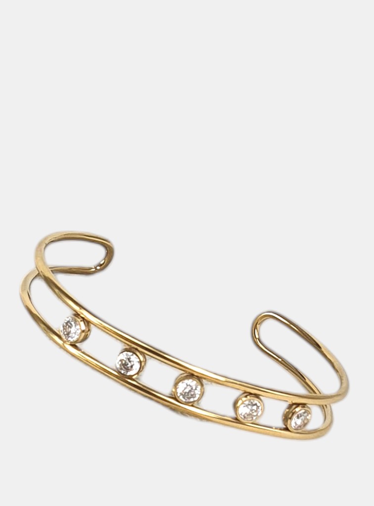 Pulsera brazalete para mujer en acero quirúrgico de diseño tipo cuff de doble banda que presenta una fila de cinco piedras de brillo redondas engarzadas a lo largo de la parte frontal, creando un estilo minimalista y elegante.