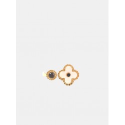 Anillo en acero quirúrgico hipoalergénico de diseño diseño de doble motivo: una flor de hojas con nácar blanco y centro oscuro, y el otro es un círculo radiante con una piedra oscura central.