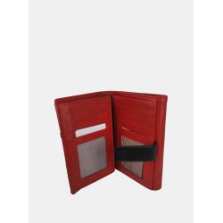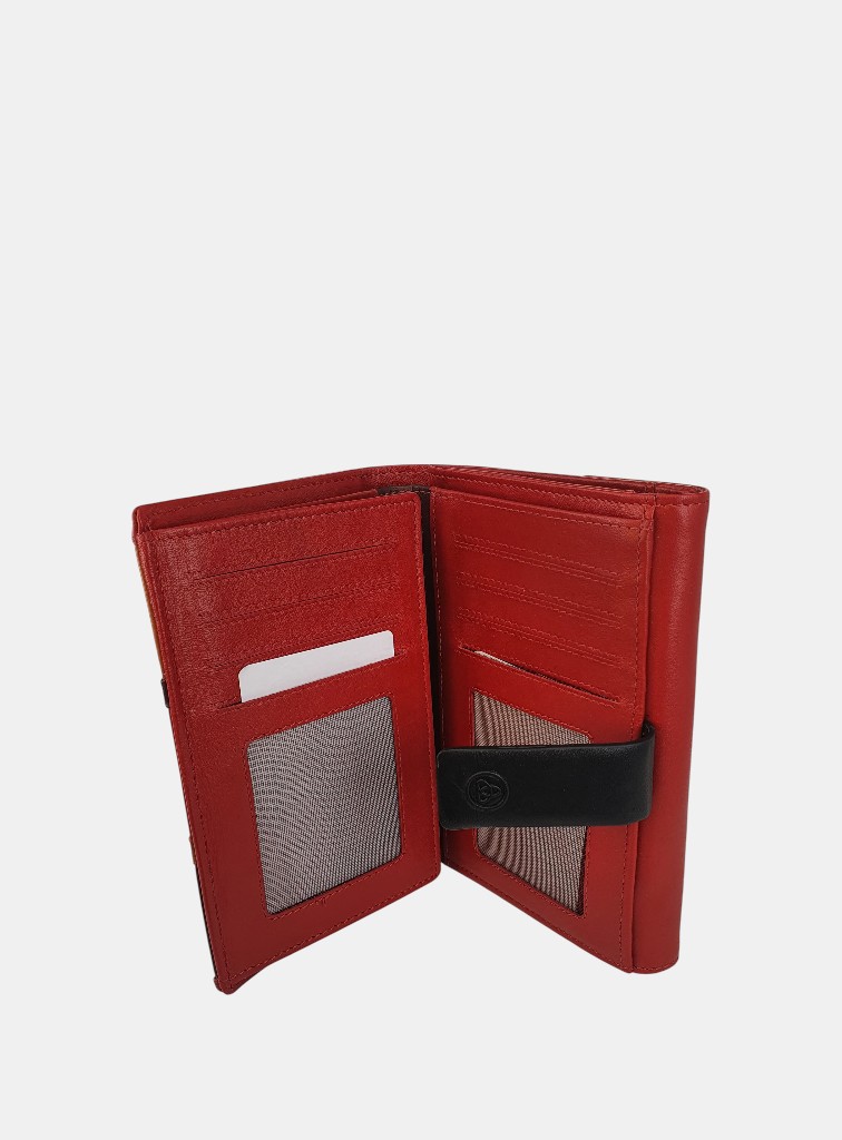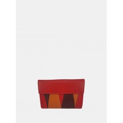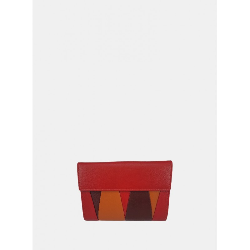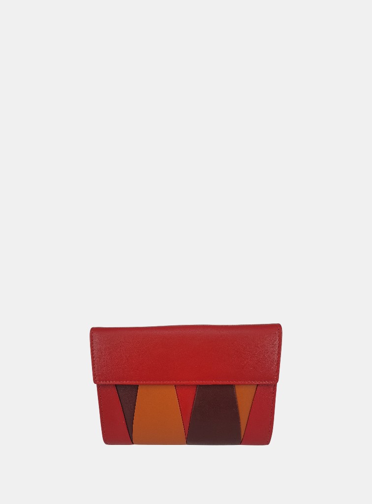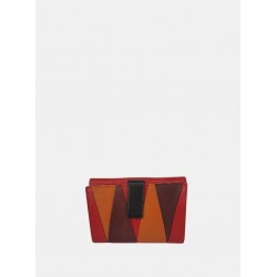 Cartera en piel para mujer con sistema de cierre de solapa a presión, con un diseño de patchwork geométrico, interior organizado para tarjeta más exterior monedero con cierre de solapa.