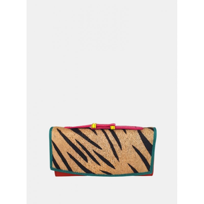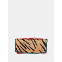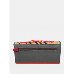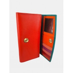 Cartera de piel para mujer. Incluye una ventana transparente para identificación y un amplio espacio para billetes. Desplegable en múltiples paneles con ranuras para tarjetas.
