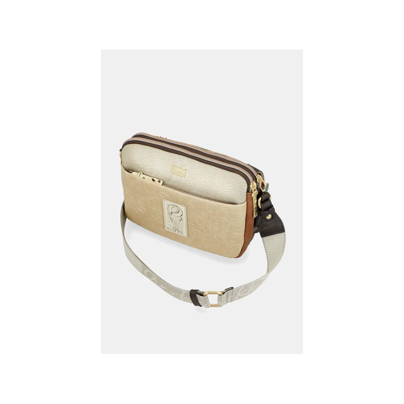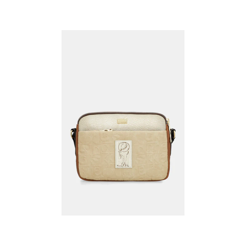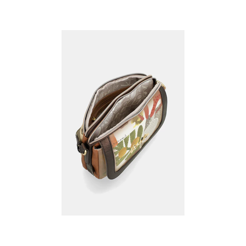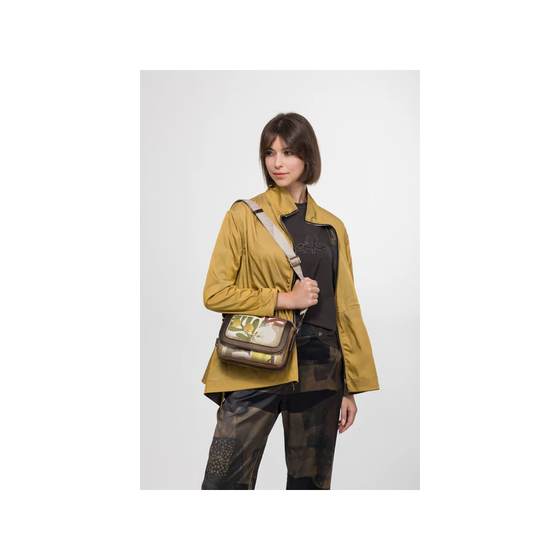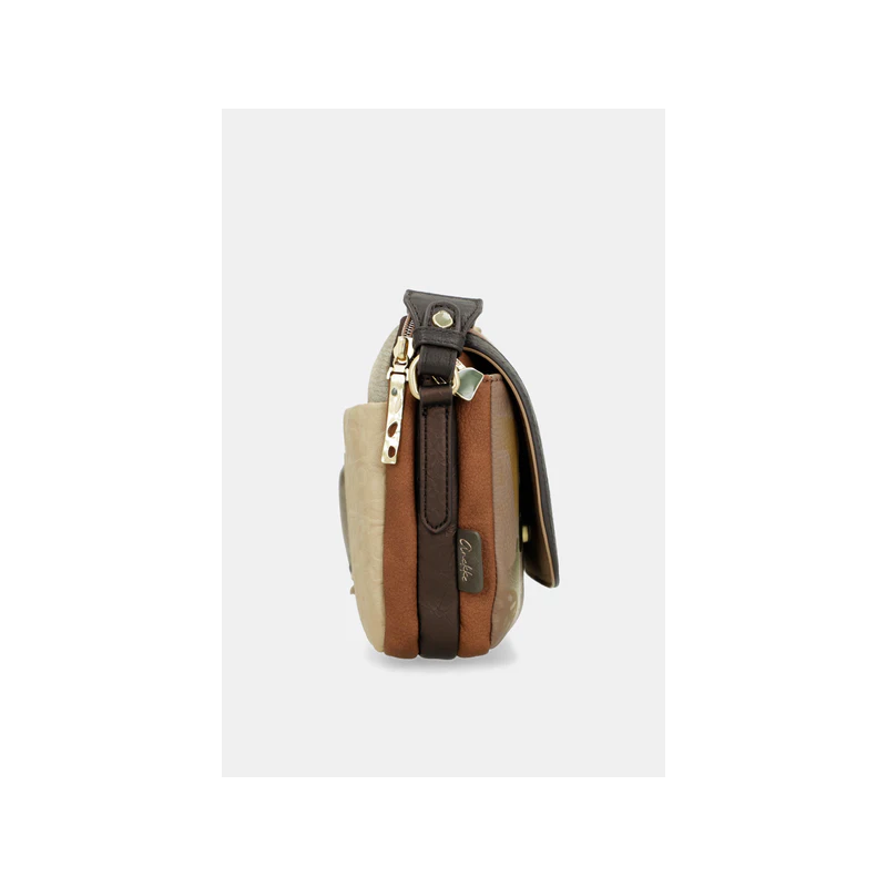 Bolso para mujer de doble compartimento uno de cierre de cremallera más otro con cierre de solapa, de diseño con texturas que recuerdan el barro cocido y estampados que parecen dibujados por el tiempo, esta cápsula es un tributo al arte hecho a manos, bolsillos exteriores e interiores más asa ajustable para llevar tipo bandolera.