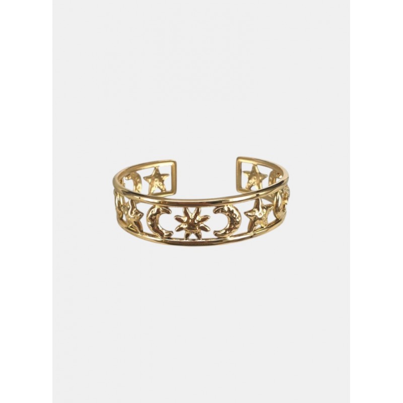 Pulsera en acero hipoalergénico tipo brazalete para mujer de diseño de luna y soles ajustable.