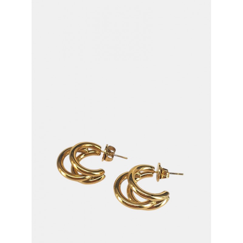 Pendientes para mujer en acero quirúrgico dorado con acabado mate, presentan un diseño elegante de tres líneas que refleja el estilo distintivo de Anartxy. Su cierre a presión garantiza comodidad y seguridad para el uso diario, mientras que su resistencia al agua y propiedades hipoalergénicas los hacen ideales para pieles sensibles. Estos aros favorecedores combinan sofisticación y funcionalidad, convirtiéndose en un accesorio imprescindible para realzar cualquier look con discreción y estilo.