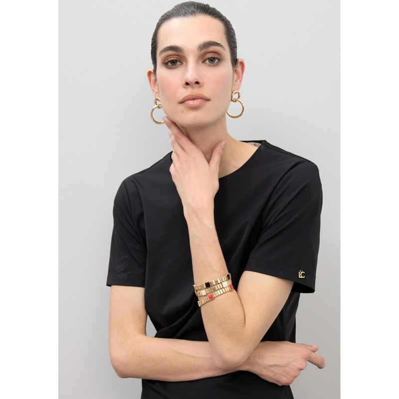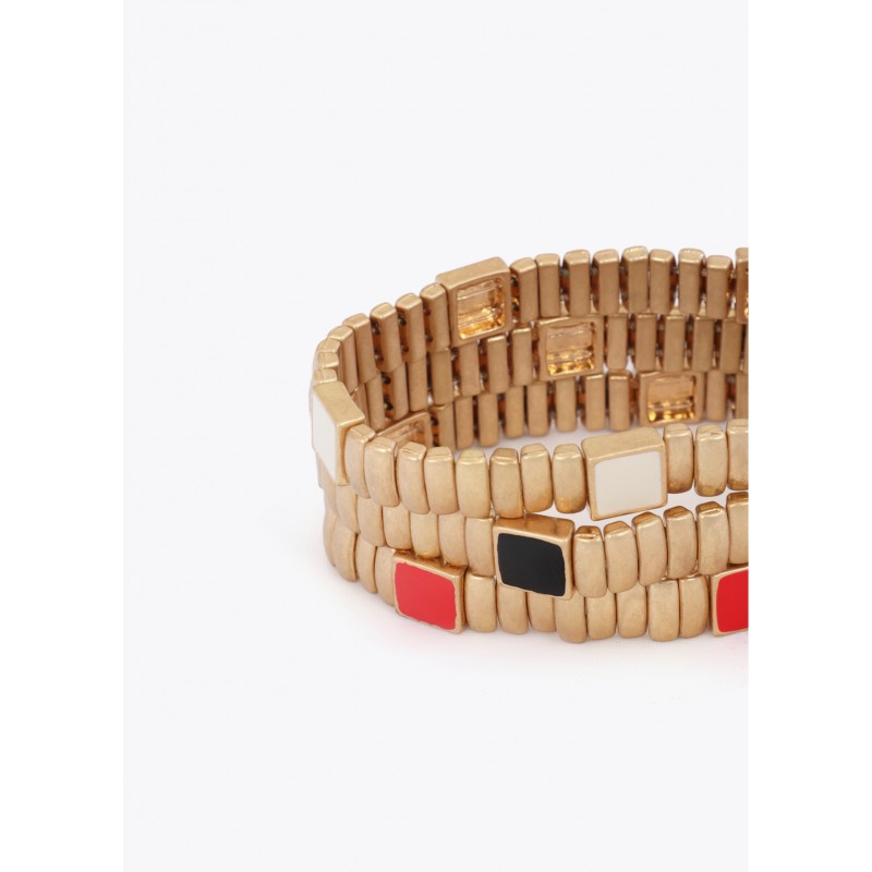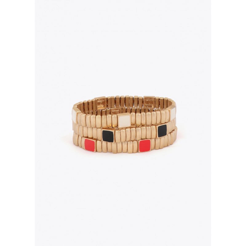 Set de pulseras elásticas en metal dorado con detalles de color rojo, blanco y negro. Perfectas para añadir un toque de sofisticación a cualquier look diario. Su diseño elástico garantiza un ajuste cómodo y seguro.